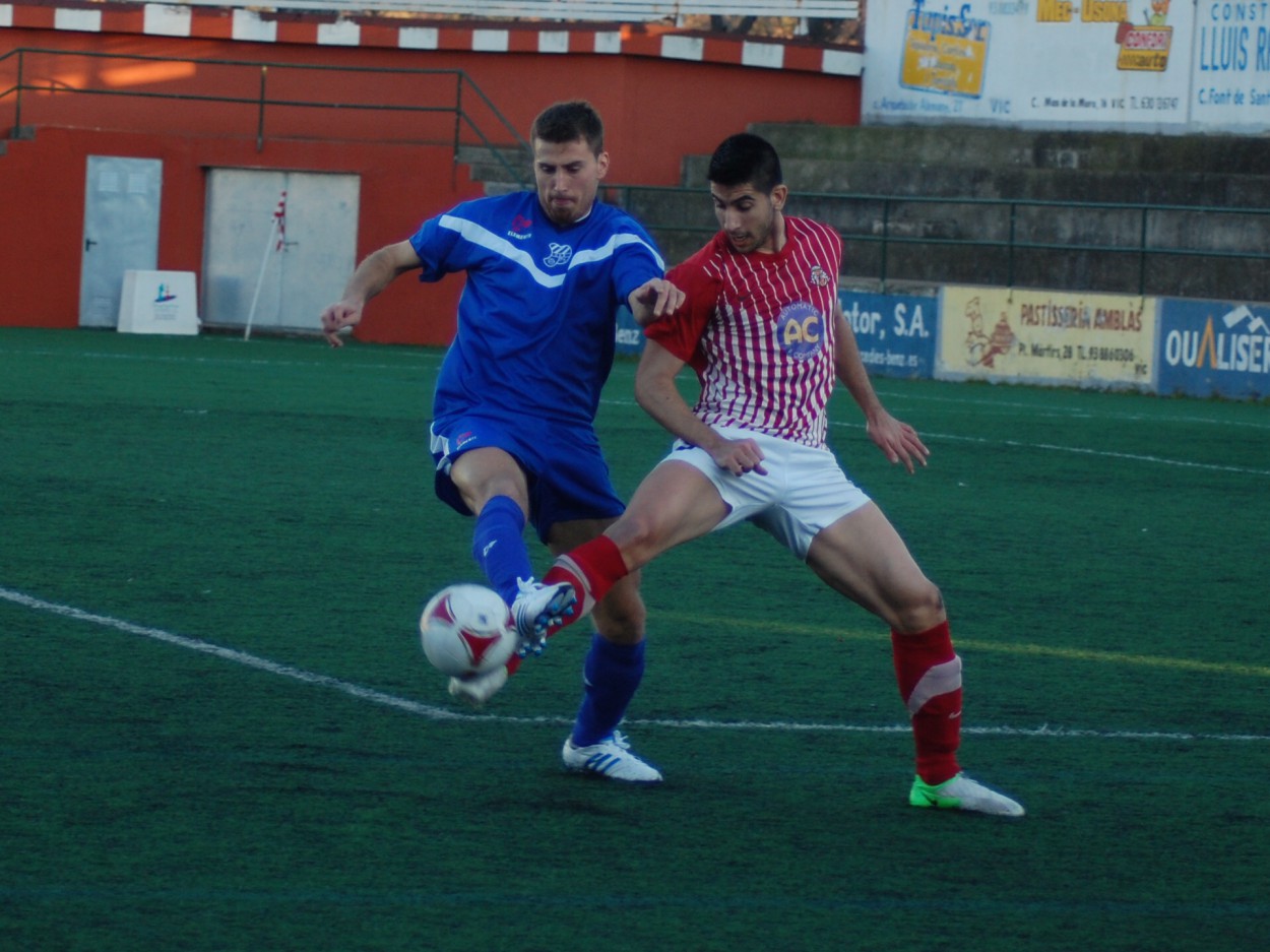 El partit va ser ensopit i va començar amb molta igualtat. El Vic va fer el seu joc defensiu. Amb la baixa de Maik, el míster local va col·locar una línia de quatre a la defensa i Pla i Héctor al mig del camp, en posició endarrerida. Amb aquest sistema, la porteria de Buetas va esdevenir un mur infranquejable, però la pólvora al davant seguia mullada. Sense ocasions, el joc es travava al mig del camp i el futbol brillava per la seva absència. Només Alexis, amb un xut massa alt, i Poves, en una rematada salvada per Rafael, van poder estrenar el marcador.
